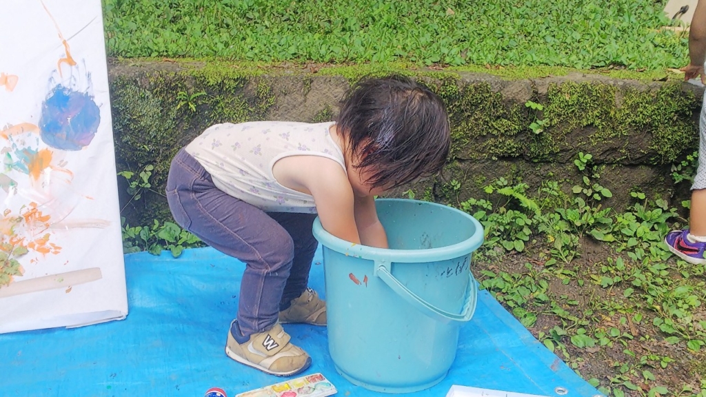 朝から蒸し暑い1日でしたが、お絵かき好きな子は手に絵具をつけて手形をつけたり、好きな色なのかな?「あお!」と行って筆で青をびびーーーっと塗ったり。