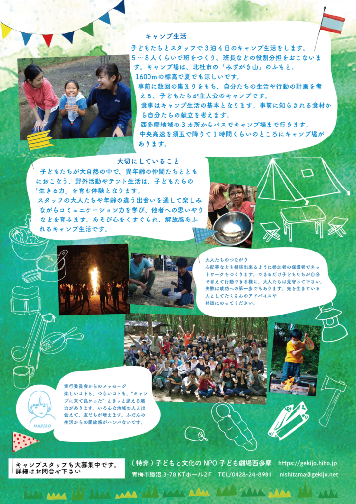 子どもたちとスタッフで3泊4日のキャンプ生活をします。