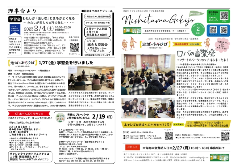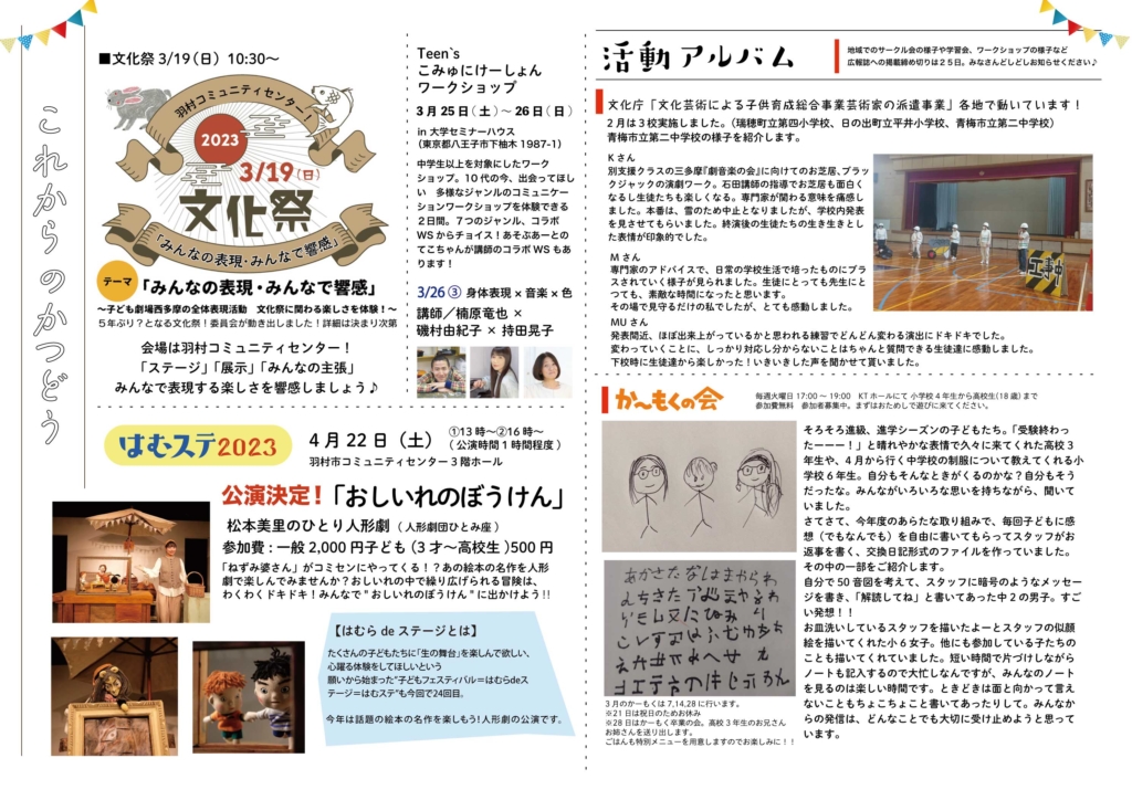 2023年3月の広報誌 2023 4/28 アーカイブ 広報部 活動アルバム 2023年 3月の広報誌 3月5日総会2月 地域のあそびば ロバの音楽座コンサート、ワークショップレポート4月22日はむらdeステージ公演決定!「おしいれのぼうけん」 など Facebooktwitter アーカイブ 広報部 活動アルバム この記事が気に入ったら いいね または フォローしてね! Follow @NGekijo