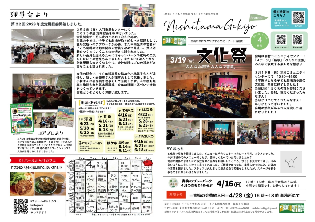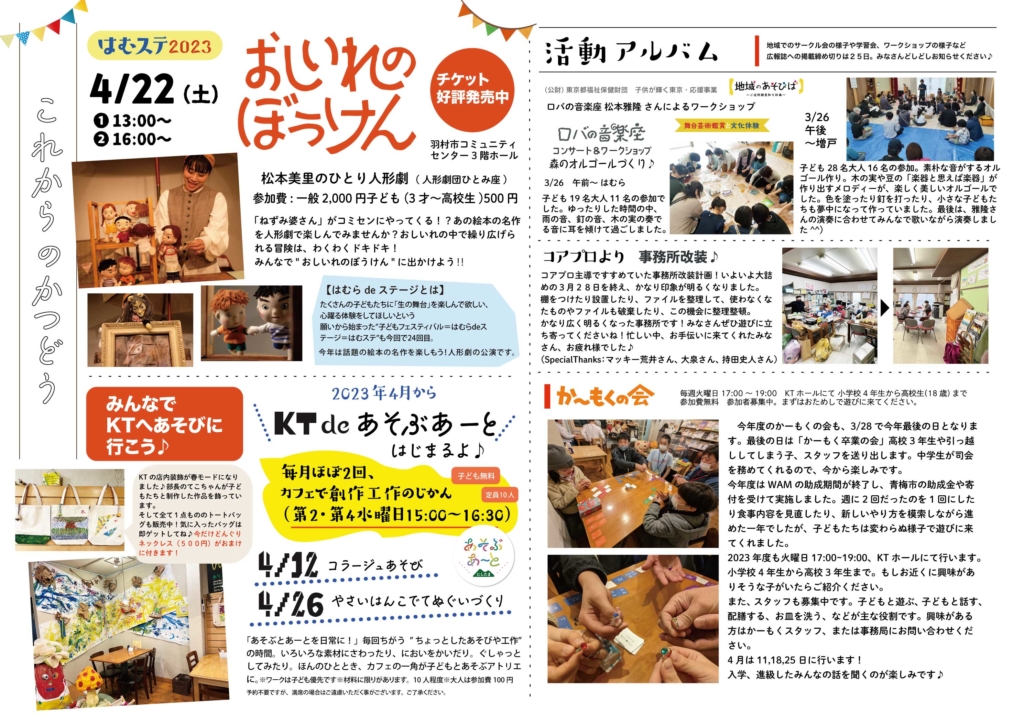 2023年4月の広報誌 2023 4/28 アーカイブ 広報部 活動アルバム 2023年 4月の広報誌 ・おしいれのぼうけんチケット好評販売中!・文化祭報告・地域のあそびば〜ロバの音楽座〜などなど Facebooktwitter アーカイブ 広報部 活動アルバム この記事が気に入ったら いいね または フォローしてね! Follow @NGekijo