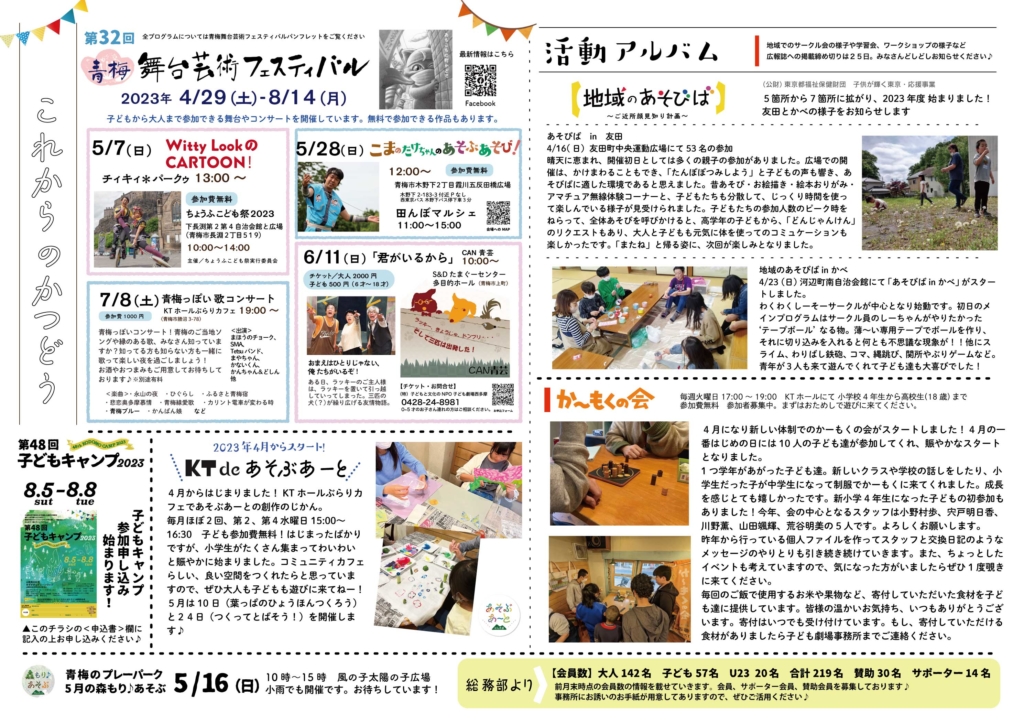 2023年5月の広報誌 2023 6/06 アーカイブ 広報部 活動アルバム 2023年 5月の広報誌 ・おしいれのぼうけん満員御礼報告 ・理事会より〜50周年実行委員大募集 ・青梅舞台芸術フェスティバル始まりました! ・地域のあそびば〜新年度スタート!友田、かべレポート などなど Facebooktwitter アーカイブ 広報部 活動アルバム この記事が気に入ったら いいね または フォローしてね! Follow @NGekijo