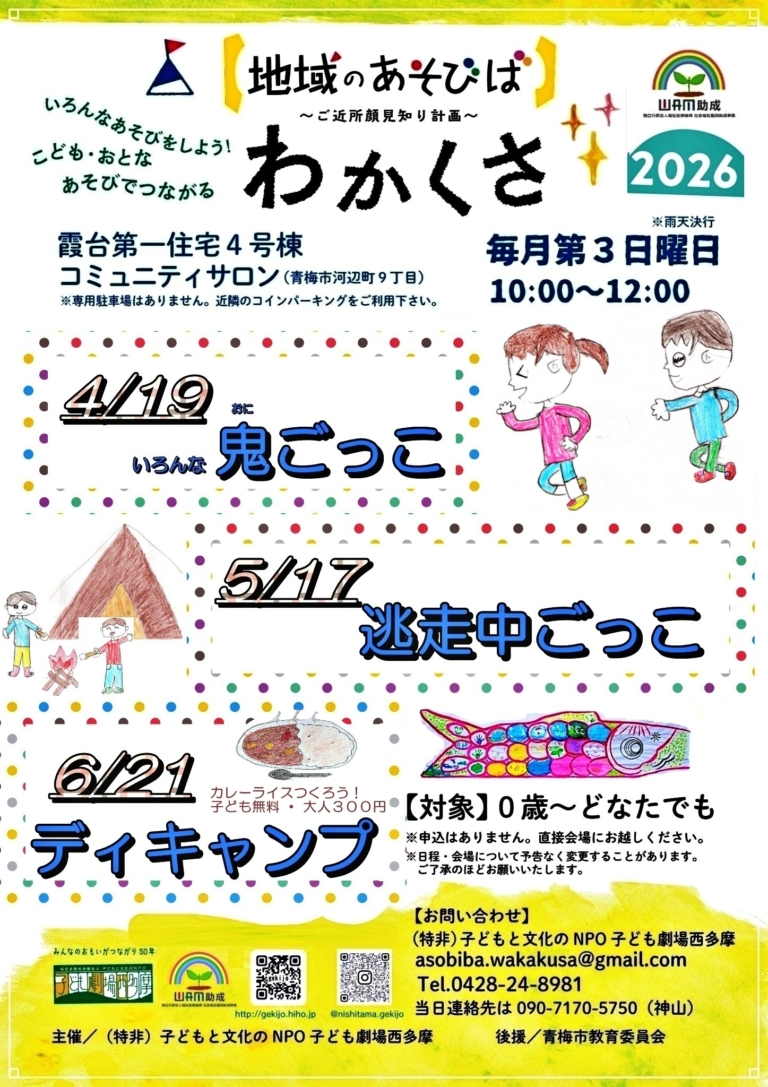 地域のあそびば「わかくさ」4月~6月 2026 4/09 TOP 地域のあそびば お知らせ 活動紹介 青梅 地域のあそびば「わかくさ」4月~6月のご案内です。 内容:4月19日:いろんな鬼ごっこ5月17日:逃走中ごっこ6月21日:ディキャンプ(カレーライスをつくろう! 参加費 子ども:無料 大人:300円) Facebooktwitter TOP 地域のあそびば お知らせ 活動紹介 青梅 この記事が気に入ったら いいね または フォローしてね! Follow @NGekijo